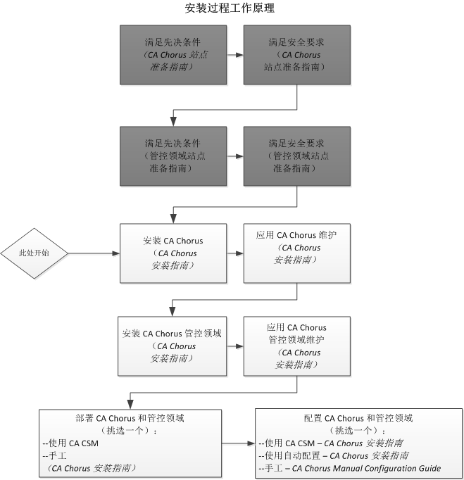 下图提供了有关 CA Chorus 和管控领域安装过程的总体概览,以及完成安装过程的指南。