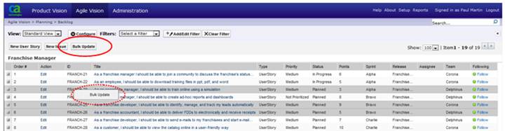 - When using the Agile Vision Bulk Update, select ‘shift’ or ‘control’ to choose the lines that require updating. You can now either select the “Bulk Update” button or right click and select “Bulk Update”.
