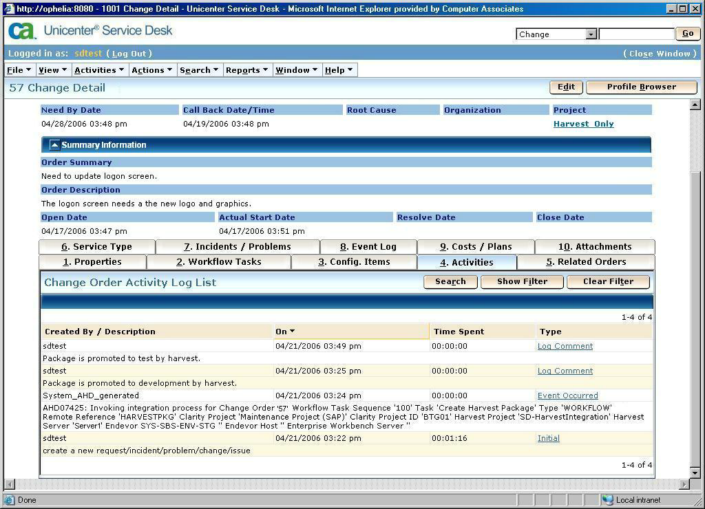 Harvest package status is tracked in Service Desk and is logged to the originating change order Change Order Activity Log List. In the following example, the list displays the initial change order creation, the Create Harvest Package workflow event, and promotion of the package in Harvest.