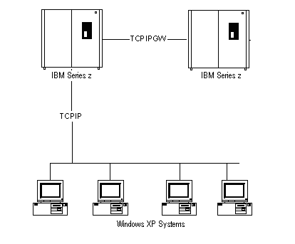 The following illustration shows a TCP/IP configuration with two connected z/OS systems and multiple PCs connected to one system using CAICCI TCP/IP client‑server: