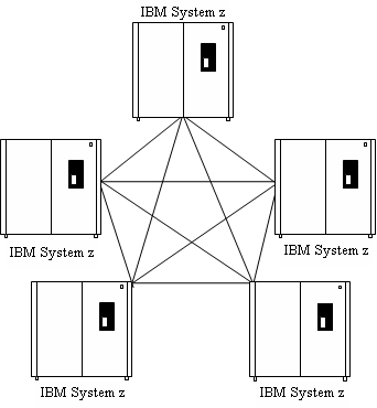Five computers are connected directly to one another using CAICCI. They are interconnected using TCP/IP, SNA, or parallel sysplex protocols for communications. In this configuration, CAICCI can maintain accurate state information.