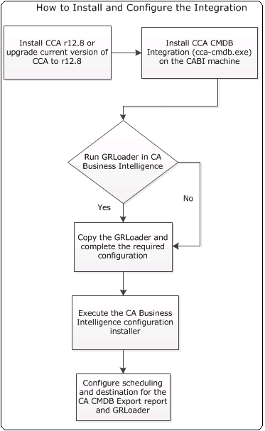 The following information and diagram provide a summary of how to configure the CA CMDB Export Report in CA Business Intelligence to integrate CA SDM r12.7 and CA Configuration Automation r12.8: