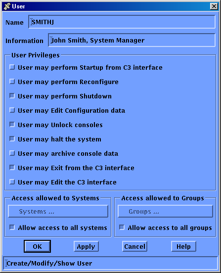 Note: If you grant access to a subset of the serviced systems defined in the configuration database, then a group definition is also required. However, granting a user access to all groups overrides the subset of systems, and provides the user with full access.