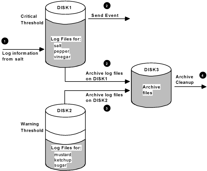 The following figure shows an example of using multiple disks for log and archive files. It also shows what happens when the critical threshold level is reached, and the archive area becomes full. The main stages in the process, as depicted in the figure, are as follows: