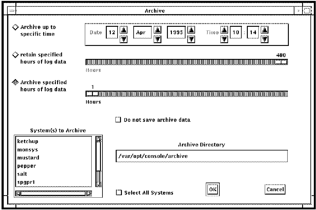Some examples are shown in the sections, Archiving the Oldest Data through Archiving Data Up to a Specified Time. If you want to delete the archived data as part of the archive process, then click Do not save archive data.