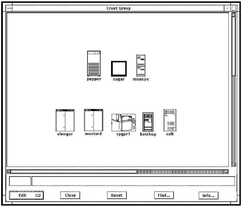 Compare the figure in the section, How to Set Up a Common Console Manager C3 View, earlier in this chapter with the figure found in section, The Group Window, in Chapter 7, “Using Console Manager From the Command Line Interface,” to see how icons can be repositioned.