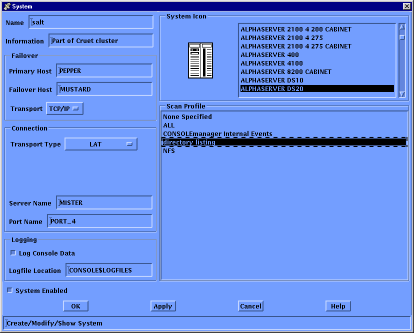 Update the definition for the system on which this event is expected to occur, to show that you are interested in this event. To do this, modify the system definition as shown in the chapter Modifying the Configuration Database and choose Scan Profile from the list shown in the following figure.