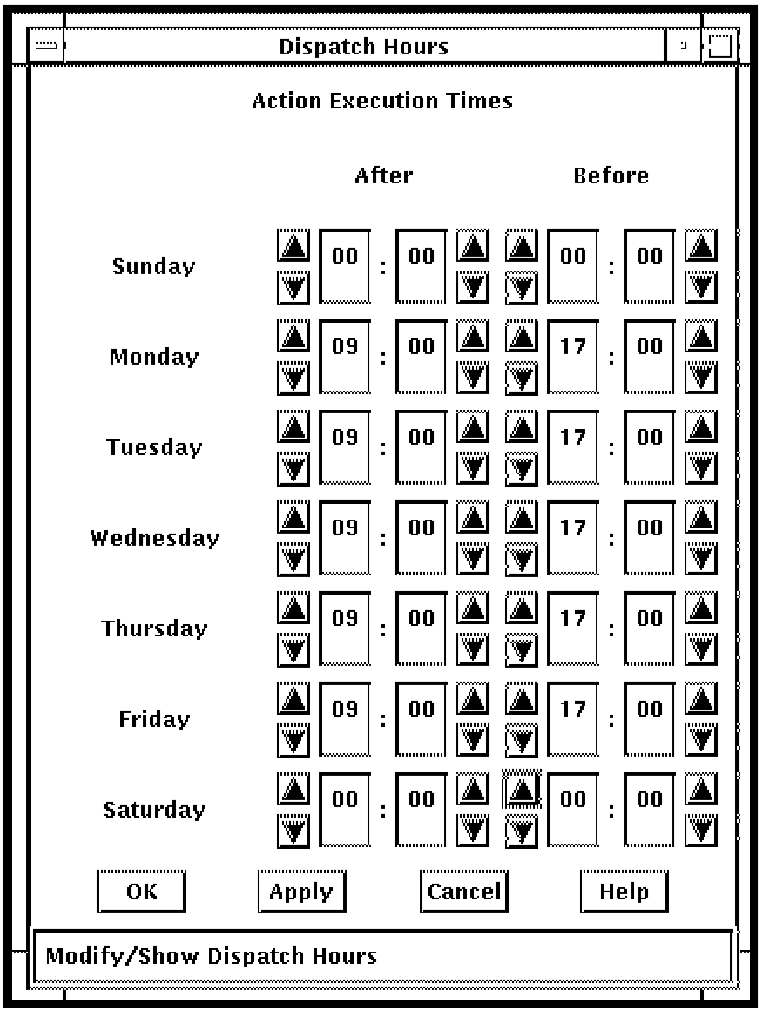 Create a dispatch for the non-working hours with the following attributes: Action to Enter Mail dispatch Information Enter Events from the Sydney Datacentre Userdata Enter opsmgr@opsmgr.lon.dec.com Deselect Execute at all Times on All Days Dispatch See the last figure in this section for the Hours... settings |