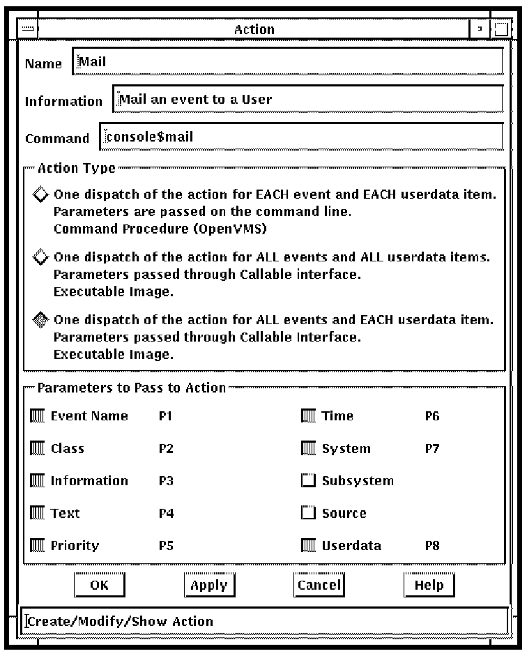 The following figure shows the action definition for the Mail routine. The Command field is CONSOLE$MAIL.