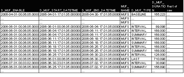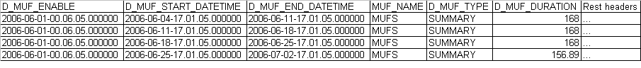D_MUF_ENABLE;D_MUF_START_DATETIME;D_MUF_END_DATETIME;MUF_NAME;D_MUF_TYPE;D_MUF_DURATION;Rest headers… 2006-06-01-00.06.05.000000;2006-06-04-17.01.05.000000;2006-06-11-17.01.05.000000;MUFS;SUMMARY;168.000;… 2006-06-01-00.06.05.000000;2006-06-11-17.01.05.000000;2006-06-18-17.01.05.000000;MUFS;SUMMARY;168.000;… 2006-06-01-00.06.05.000000;2006-06-18-17.01.05.000000;2006-06-25-17.01.05.000000;MUFS;SUMMARY;168.000;… 2006-06-01-00.06.05.000000;2006-06-25-17.01.05.000000;2006-07-02-17.01.05.000000;MUFS;SUMMARY;156.890;…
