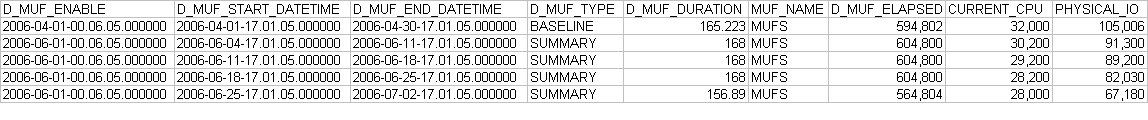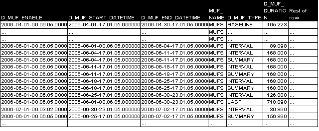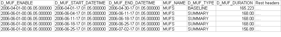 D_MUF_ENABLE;D_MUF_START_DATETIME;D_MUF_END_DATETIME;MUF_NAME;D_MUF_TYPE;D_MUF_DURATION;Rest headers 2006-04-01-00.06.05.000000;2006-04-01-17.01.05.000000;2006-04-30-17.01.05.000000;MUFS;BASELINE;165.223;… 2006-06-01-00.06.05.000000;2006-06-04-17.01.05.000000;2006-06-11-17.01.05.000000;MUFS;SUMMARY;168.000;… 2006-06-01-00.06.05.000000;2006-06-11-17.01.05.000000;2006-06-18-17.01.05.000000;MUFS;SUMMARY;168.000;… 2006-06-01-00.06.05.000000;2006-06-18-17.01.05.000000;2006-06-25-17.01.05.000000;MUFS;SUMMARY;168.000;… 2006-06-01-00.06.05.000000;2006-06-25-17.01.05.000000;2006-07-02-17.01.05.000000;MUFS;SUMMARY;156.890;…