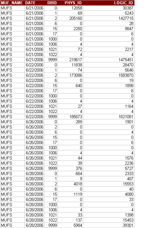 MUF_NAME;DATE ; DBID; PHYS_IO; LOGIC_IO; MUFS ;2006-06-21; 0; 12058; 30387; MUFS ;2006-06-21; 1; 69; 5243; MUFS ;2006-06-21; 2; 205160; 1427715; MUFS ;2006-06-21; 6; 0; 28; MUFS ;2006-06-21; 15; 2250; 9847; MUFS ;2006-06-21; 17; 0; 6; MUFS ;2006-06-21; 1000; 0; 0; MUFS ;2006-06-21; 1006; 4; 4; MUFS ;2006-06-21; 1019; 72; 2217; MUFS ;2006-06-21; 1020; 4; 4; MUFS ;2006-06-21; 9999; 219617; 1475451; MUFS ;2006-06-22; 0; 11838; 28470; MUFS ;2006-06-22; 1; 74; 5646; MUFS ;2006-06-22; 2; 173086; 1583870; MUFS ;2006-06-22; 6; 0; 19; MUFS ;2006-06-22; 15; 640; 1898; …… MUFS ;2006-06-28; 1019; 33; 1398; MUFS ;2006-06-28; 1020; 137; 15453; MUFS ;2006-06-28; 9999; 5984; 39301;