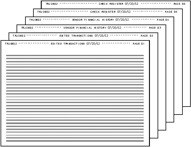 The reports for the job discussed in this chapter are comprised of exclusive segments. For example, the edited transactions from TRJOB02, the vendor financial history, and the check register, all form unique and exclusive segments, as shown in this illustration.