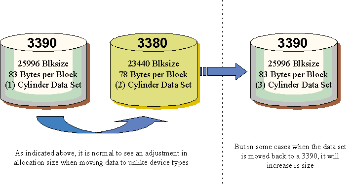 For example, when a data set is moved from a 3390 to a 3380, an allocation adjustment to the target 3380 must be made. This adjustment is necessary because the track size of a 3390 is larger than that of a 3380. In this particular case, the allocation size of the target data set will most likely increase. In fact, it is normal for a 1 cylinder 3390 data set that is moved to a 3380 to increase to 2 cylinders on the target volume, as illustrated as follows: