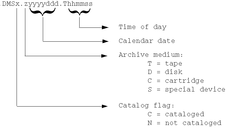 The base name of the data set is taken from the data set name in the MIGRATE dd statement for the primary tape, and the MIGRATEC dd statement for the copy tape. CA Disk generates a 22- character appendage to the base name as follows: