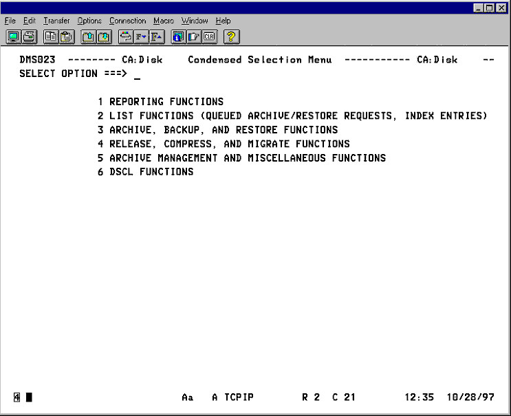 Selecting the CA Disk option on the ISPF primary option menu enters this panel. It is displayed only when users have more than 15 CA Disk options available to them. This menu allows the user to select from various categories of CA Disk functions presented on the next menu level. The following illustration is a sample Condensed Selection Menu: