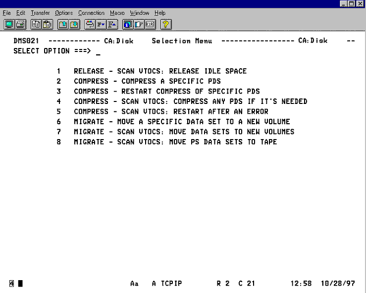 This panel is displayed from either the ISPF primary options menu or from the CA Disk CONDENSED MENU. It allows the user to pick the specific CA Disk ISPF interface function to use. The following illustration is a sample Selection Menu (Release/Compress/Migrate):