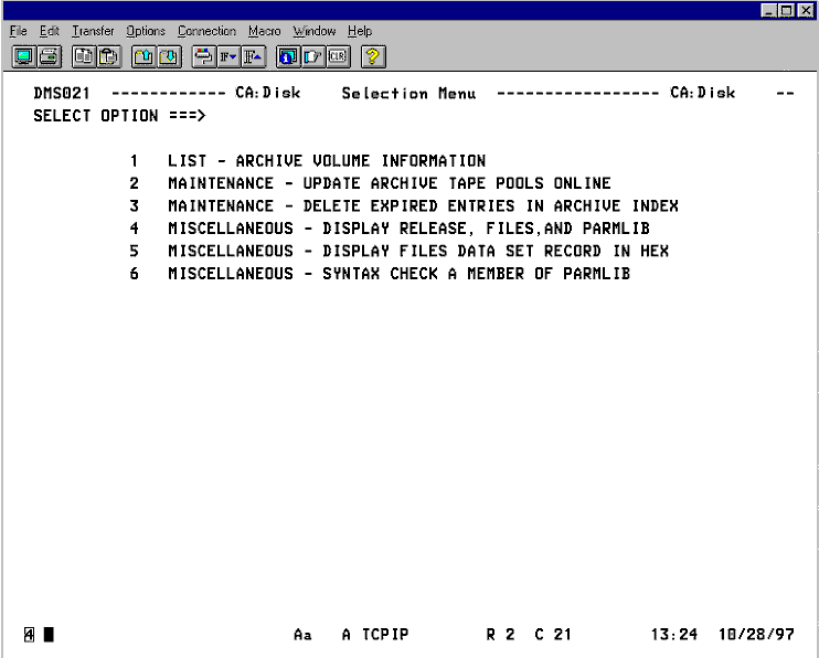 This panel is displayed from either the ISPF primary options menu or from the CA Disk CONDENSED MENU. It allows the user to pick the specific CA Disk ISPF interface function to use. The following illustration is a sample Selection Menu (Archive Management):