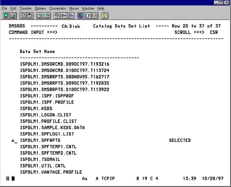 This panel is displayed when a pattern data set name is entered on an explicit data set processing screen. It is a list of data set names from the system catalog that match the specified pattern name. The user can enter an S by the name of the data set to be processed.