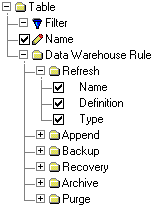 You can create a table report that lists data warehouse rules assigned to each table in your dimensional model from the Report Editor. Typically, rule definitions document the frequency and timing of data warehouse maintenance. Using the data warehouse rule report, you can report on six types of standard management rules: