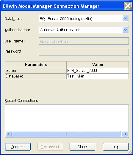 You can select a database connection from the Recent Connections panel to automatically populate the Database or Connection String previously used.