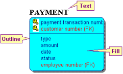 A diagram has several types of graphic elements that you can enhance with color. For example, you can individually specify text, fill, and line sizes and colors for entities, attributes and relationships, or use themes to define the default display of certain objects by diagram, or by model.
