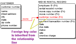 The color of an object can be related to the color it inherits from other objects in the diagram. For example, you can choose to have a foreign key attribute or column, inherit its font and color from its parent primary key or relationship.