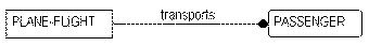 Relationships are displayed as a line connecting two entities, with a dot on one end, and a verb phrase written along the line. In the previous examples, the verb phrases are the words inside the brackets, such as <sells>. The following figure shows the relationship between PLANE-FLIGHTs and PASSENGERs on that flight: