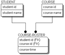 You can eliminate a many-to-many relationship by creating an associative entity. In the following figure, the many-to-many relationship between STUDENT and COURSE is resolved by adding the COURSE-ROSTER entity.