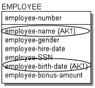 After you select a primary key from a list of candidate keys, you can designate some or all of the remaining candidate keys as alternate keys. Alternate keys are often used to identify the different indexes, which are used to quickly access the data. In a data model, an alternate key is designated by the symbol (AKn), where n is a number that is placed after the attributes that form the alternate key group. In the EMPLOYEE entity, “employee-name” and “employee-birth-date” are members of the alternate key group.