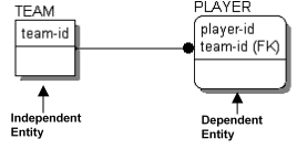 Dependent entities are further classified as existence dependent, which means the dependent entity cannot exist unless its parent does, and identification dependent, which means that the dependent entity cannot be identified without using the key of the parent. The PLAYER entity is identification dependent but not existence dependent, since PLAYERs can exist if they are not on a TEAM.