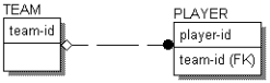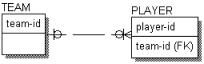 A dashed line connecting the entities indicates a non-identifying relationship. If you connect the TEAM and PLAYER entities in a non-identifying relationship, the “team-id” migrates to the non-key as shown in the figure below: