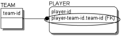 The foreign key attribute of “player-team-id.team-id” in the PLAYER entity shows the syntax for defining and displaying a rolename. The first half (before the period) is the rolename. The second half is the original name of the foreign key, sometimes called the base name.