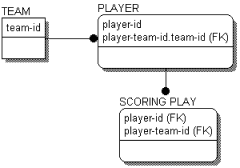 Once assigned to a foreign key, a rolename migrates across a relationship just like any other foreign key. For example, suppose that you extend the example to show which PLAYERs have scored in various games throughout the season. The “player-team-id” rolename migrates to the SCORING PLAY entity (along with any other primary key attributes in the parent entity), as shown in the figure below: