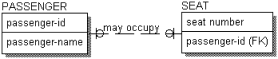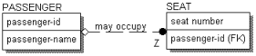 The cardinality for the relationship, indicated with a Z in IDEF1X and a single line in IE, states that a PASSENGER <may occupy> zero or one of these SEATs on a flight. Each SEAT can be occupied, in which case the PASSENGER occupying the seat is identified by the “passenger-id,” or it can be unoccupied, in which case the “passenger-id” attribute is empty (NULL).