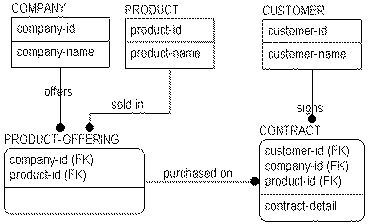 If you consider the business rule stated in the figure, you can see that a CONTRACT represents a three-way relationship among COMPANY, PRODUCT, and CUSTOMER. The structure indicates that many COMPANYs sell many PRODUCTs to many CUSTOMERs. When you see a relationship like this, however, there are business questions that should be answered. For example, “Must a product be offered by a company before it can be sold?” “Can a customer establish a single contract including products from several different companies?” and, “Do you need to keep track of which customers 'belong to' which companies?” Depending on the answers, the structures may change.