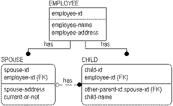 If you noticed that EMPLOYEE, SPOUSE, and CHILD all represent instances of people, you may want to try to combine the information into a single table that represents facts about people and one that represents facts about relationships. To fix the model, you can eliminate CHILD and SPOUSE, replacing them with PERSON and PERSON-ASSOCIATION. This lets you record parentage and marriage through the relationships between two PERSONs captured in the PERSON-ASSOCIATION entity.