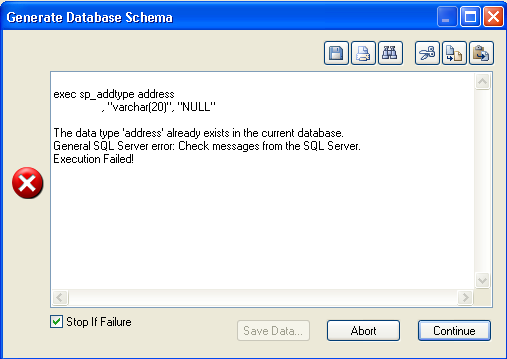 As the schema is generated, you receive status information. When you select the Stop If Failure check box in the dialog, you can choose to Continue or Abort the generation.