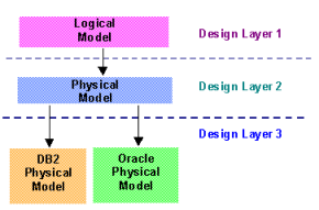 In the simplest view of design layer hierarchy, the first design layer is a logical data model that captures the business requirements for an application. Then in a second design layer, those business requirements are transformed into database implementation rules in a physical data model. A generic physical model may be created using generic ODBC as the target database. A third design layer may represent different physical implementations of the same data model, but on different target server platforms.