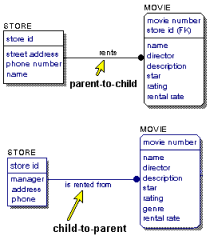 - Parent-to-child verb phrases describe how the parent is related to the child. In the first example below, the verb phrase states that “A STORE rents A MOVIE.”