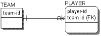 In IDEF1X notation, the type of the relationship that connects two entities enforces the concept of dependent and independent entities. If you want a foreign key to migrate to the key area of the child entity (and create a dependent entity as a result), you can create an identifying relationship between the parent and child entities. A solid line connecting the entities indicates an identifying relationship. In IDEF1X notation, the line includes a dot on the end nearest to the child entity, as shown in the following figure: