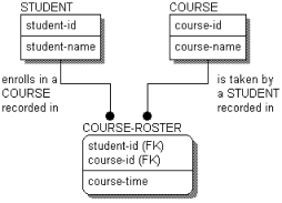 You would read: A STUDENT <enrolls in a COURSE recorded in> one or more COURSE-ROSTERs, and A COURSE <is taken by a STUDENT recorded in> one or more COURSE-ROSTERs.Although the verb phrases are now quite long, the reading follows the standard pattern; reading directly from the parent entity to the child.