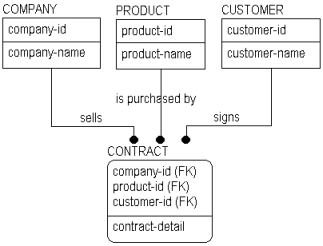 If you consider the business rule stated in the figure, you can see that a CONTRACT represents a three-way relationship among COMPANY, PRODUCT, and CUSTOMER. The structure indicates that many COMPANYs sell many PRODUCTs to many CUSTOMERs. When you see a relationship like this, however, there are business questions that should be answered. For example, “Must a product be offered by a company before it can be sold?” “Can a customer establish a single contract including products from several different companies?” and, “Do you need to keep track of which customers 'belong to' which companies?” Depending on the answers, the structures may change.