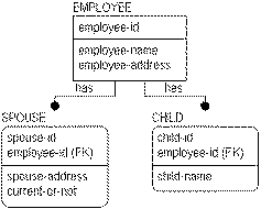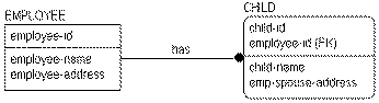 The attribute named “emp-spouse-address” is included in CHILD, but this design is a second normal form error. The instance data highlights the error. As you can see, Don is the parent of Tom, Dick, and Donna but the instance data shows two different addresses recorded for Don's spouse. Perhaps Don has had two spouses (one in Berkeley, and one in Cleveland), or Donna has a different mother from Tom and Dick. Or perhaps Don has one spouse with addresses in both Berkeley and Cleveland. Which is the correct answer? There is no way to know from the model as it stands. Business users are the only source that can eliminate this type of semantic problem, so analysts need to ask the right questions about the business to uncover the correct design.
