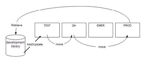 In this lifecycle, new or existing code is developed in the development library. After the code has been unit tested by the application developer, the code is added to the Test stage for unit testing. When the code is ready for system testing, it is moved to the Quality Assurance stage. Finally, when the code is ready to be used by customers, the code is moved to the Production stage. Any fixes are applied to production code in the Emergency stage.