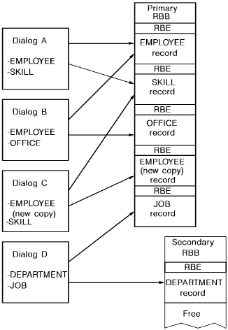 When dialog A begins executing, CA ADS allocates buffers for the EMPLOYEE and SKILL record types. Dialog B uses the previously allocated EMPLOYEE record buffer, but requires a new buffer for the OFFICE record. Dialog C requests and receives a new copy of the EMPLOYEE record buffer, but uses the previously allocated SKILL record buffer. Dialog D requires new buffers for both the DEPARTMENT and JOB records. CA ADS allocates a secondary RBB to accommodate the DEPARTMENT record, but uses the remaining space in the primary RBB for the JOB record.