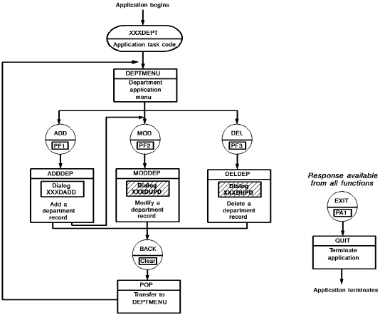 As the diagram indicates, dialog XXXDUPD is executed by both functions MODDEP and DELDEP. Therefore, process modules that you write for dialog XXXDUPD must be able to both modify and delete department information in the database.