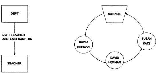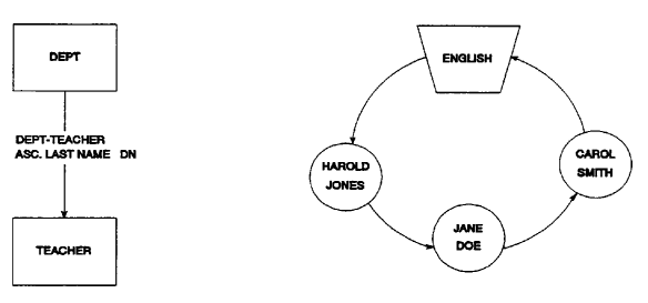 In a set that is sorted in descending order, the sort key of the previous record in the set is greater than the sort key of the current record. In a set that is sorted in ascending order, the sort key of the previous record is less than the sort key of the current record. For example, in Figure 2.10, the DEPT-TEACHER set should be sorted in ascending order by last-name. Jane Doe is out of sequence, however; she should precede Harold Jones in the set. CA IDMS/DB Audit corrects this set so that ENGLISH points to Jane Doe, Jane Doe points to Harold Jones, and Harold Jones points to Carol Smith.