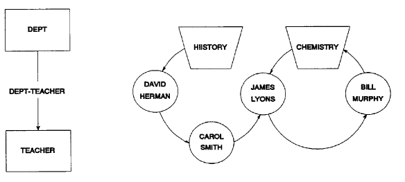 The set owned by the HISTORY record in Figure 2.13 is broken. When this set is walked in the next direction, a second owner record (CHEMISTRY) is retrieved. Carol Smith's next db-key points to James Lyons' record, which is in the set occurrence owned by CHEMISTRY.