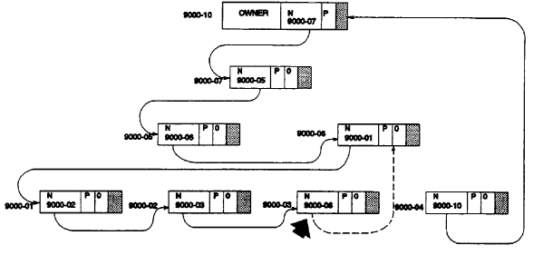 Errors in next, prior, and owner pointers in integrated index sets are detected when you specify USERSETS in the AUDIT statement, and are fixed when you specify USERSETS in the FIX statement. CA IDMS/DB Audit generates the same messages for pointer errors in other sets in the database. Figure 2.18 shows a typical integrated index structure with a bad next pointer. The NEXT pointer in record 9000-03 points to the level above instead of the next record.